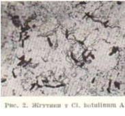 сохраняются в течение долгого времени. Однако при этом некоторая часть спор подвергается разрушению и освобождает токсин; поэтому продукты, содержавшие большое количество спор, после замораживания могут стать ядовитыми. Споры молодых культур устойчивее к нагреванию, чем споры старых культур. Наиболее устойчивы споры типа А, менее устойчивы типов В, Си Е. В среде, содержащей значительное количество жира, споры гораздо устойчивее к высокой температуре. Споры А и В хорошо переносят кипячение в течение 5 часов и погибают при этой температуре спустя 6—8 часов; при нагревании до 105° гибнут через 1—2 часа, при 120° — через 20—30 мин. Встречаются штаммы возбудителей Б., споры которых переносят 120° в течение нескольких часов. После воздействия высокой температуры при посеве на питательные среды споры могут очень долго не прорастать. Споры возбудителей ботулизма устойчивы к бактерицидным веществам: 10% НСl убивает их при комнатной температуре лишь через час; 20% раствор формалина через 24 часа; этиловый спирт через 2 месяца. При посеве спор в желудочный, кишечный и панкреатический соки, а также в желчь они прорастали, а в некоторых случаях вырабатывали токсин, что указывает на возможное прорастание спор в кишечнике человека и животных.