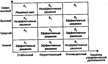 Матрица эффективности управленческих решений в виде взаимодействия уровней неопределенности и характера управленческой деятельности определяет условия получения эффективных УР.
