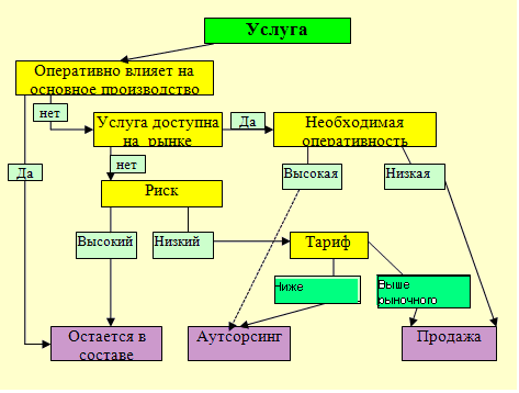 Эта схема показывает первое приближение выбора решения. Оно не оптимально, но для принципиального решения - идти на аутсорсинг или нет - вполне годится.