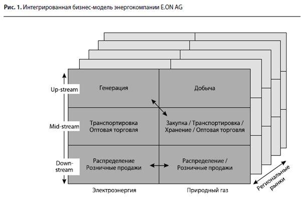E.ON AG Согласно исследованию PWC компания E.ON AG занимает второе место среди всех энергокомпаний мира [10]. Интегрированная бизнес-модель E.ON AG (рис. 1) по трем измерениям охватывает все виды деятельности отраслевой цепочки создания стоимости [11].