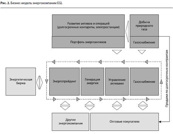 Таким образом, бизнес-модель EGL построена на тесных взаимосвязях между системой газоснабжения, генерацией (газовые электростанции с комбинированной выработкой), транспортной инфраструктурой (линии электропередач), торговыми площадками (энергетические биржи) и сопутствующими финансовыми инструментами.