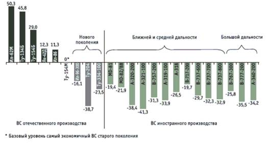 Эксплуатируемые на сегодняшний день самолеты были разработаны в 60-70-х годах ХХ века и относятся к прошлому, а то и позапрошлому поколению авиатехники. Самый распространенный наш пассажирский самолет ТУ-154 - это аналог "Боинга"-727, которых в мире осталось очень мало, всего около 4%. Чтобы понять, насколько велико отставание технического состояния эксплуатируемого парка авиакомпаний РФ, стоит сравнить показатели топливной эффективности (рис.2, Приложение).