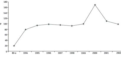 Рисунок 6 Динамика количества российских аэропортов (1992-2002 гг.)