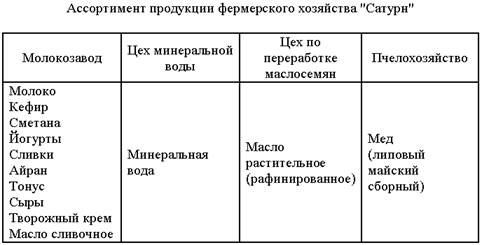 Обычно предприятие предлагает группу близко связанных между собой товаров составляющих продуктовую линию или товарный ассортимент. В табл.7.4. представлен ассортимент продукции фермерского хозяйства "Сатурн".