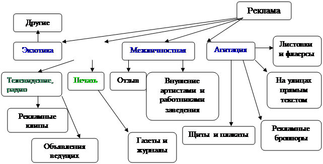 Реклама в ресторанном бизнесе в основном схожа с рекламой любой другой продукции или товара и призвана привлекать внимание потенциальных клиентов. При этом могут использоваться различные средства рекламы: ролики на телевидении, рекламные блоки в печатных изданиях, листовки, флаеры и другие (рисунок 2).[6]