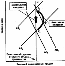 В мире адаптивных ожиданий мероприятие в рамках экспансионистской экономической политики, вызывающее сдвиг кривой совокупного спроса из AD0