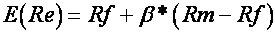 В данном случае Rf представляет ставку, свободную от риска (обычно это государственные облигации или другие виды правительственных долговых инструментов на развивающихся рынках); Re- степень риска, не подверженного диверсификации; а Rm- рыночный риск. Премия по рыночному риску представлена разницей между значениями Rf и Rm. Риск, не подверженный диверсификации, то есть , может быть определен путем деления коварианта компании с рынком на общую вариацию самого рынка.