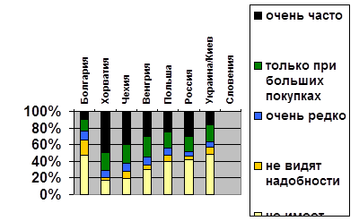 Зростання мобільності споживачів очевидне. Рівень використовування автомобіля під час придбання товарів відповідає купівельним спроможностям споживачів окремих країн, а також їх географічному розташуванню. Так, в Словенії частка домогосподарств, регулярно що користуються автомобілем під час придбання продуктів харчування і щоденних непродовольчих товарів, досягає відмітки 87 % і в більшості країн ЦВЕ коливається в межах 45-65%, а в Румунії і Болгарії дотепер знаходиться нижче за відмітку 30 % (малюнок 1). Частка домогосподарств, в яких покупці читають рекламні брошури, поширювані сітями роздрібної торгівлі, і потім купують товари на основі отриманої інформації, дуже висока в Словенії, Словаччині, Чехії, а також в Києві. Товари, що випускаються під торговою мазкій роздрібній сіті (private labels) користуються найбільшою популярністю в Словаччині і Угорщині.