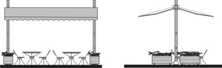 Никакая летняя площадка не может обойтись без навеса или зонтика, шатра, палатки или другой конструкции – без этого теряется сам смысл летнего кафе. Летние конструкции не только исполняют роль ограждения, защищают от солнца и дождя, но и служат рекламой, как для самого кафе, так и для фирмы-поставщика, чей логотип нанесен на тент. Преимущество таких конструкций – они очень мобильны, легко и просто монтируются, что позволяет развернуть кафе на любом месте в течение светового дня. Сама тентовая ткань водо- и газонепроницаема. Иногда конструкции летнего кафе комплектуются тканевыми стенами и окнами из прозрачного пластика, которые защищают от непогоды. Размеры и формы летнего кафе могут быть любыми, все зависит от фантазии владельца, его финансовых возможностей и размера отведенного участка.