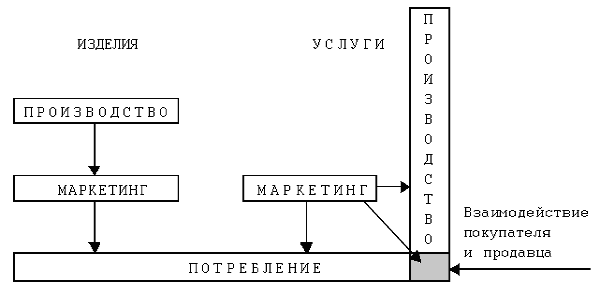 Если рассмотреть этапы процессов выполнения услуги и предложений товаров, то можно видеть, что товары вначале производятся, а затем продаются. Услуги же вначале продаются, а затем производятся и потребляются.