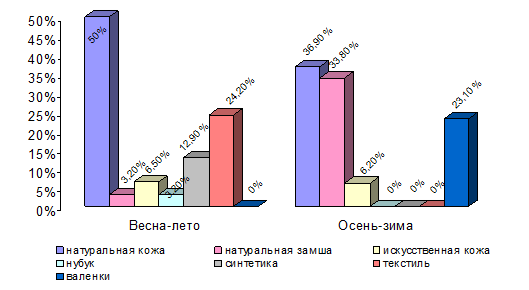 Таким образом, из табл.3.1. и 3.2. видно, что основой формирования спроса на товар является величина закупочной цены и стадия жизненного цикла, на которой в данный момент находится тот или иной товар. Безусловно, на формирования спроса большое влияние оказывает сезонность. Так, во время летнего сезона, ассортимент зимней группы либо не выставляется вообще, либо распродается с большими скидками. И здесь нужно активно стремиться не упускать возможности рекламы для сбыта и продвижения товара на рынке обуви в условиях жесткой конкуренции.