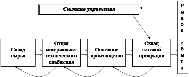 Из схемы видно, что система управления дает команду на изготовление определенного количества асбестоцементных листов конечному звену технологической цепи. Затем заказ на определенное количество материалов поступает в отдел материально-технического снабжения, а уже из него отправляется распоряжение складу сырья на предоставление необходимого количества сырья для производства продукции.
