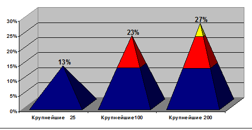 На сегодняшний день годовой товарооборот 25 крупнейших розничных сетей мира равен примерно $842 млрд., что составляет 13% от суммарных мировых розничных продаж (см. рис. 2). Первая сотня крупнейших операторов розничной торговли за вычетом объемов «первой четверти» дает 10 дополнительных пунктов доли от измеряемого мирового рынка розничных продаж, а следующая сотня совокупно приносит всего лишь 4 пункта соответственно.