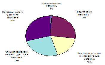 По данным исследований, проведенным в 12 крупнейших городов Украины, на долю универсальных магазинов приходится не более 1% от числа всех торговых точек, наибольшее распространение получили малые «удобные» магазины.
