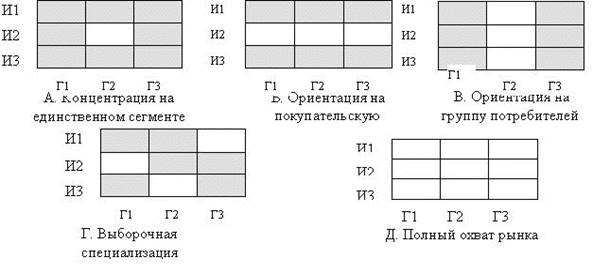 - сегментация – ориентация деятельности фирмы не на весь рынок в целом (один товар на всех потребителей), а на отдельные группы потребителей, целевые сегменты, предлагая каждому сегменту товар со своими характеристиками, качеством, ценами.