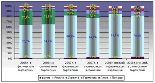 Значительно снизились в рассматриваемом периоде объемы поставок сыров и творога украинского производства. В течение 2007 г. Украина поставила на белорусский рынок 269,0 т на сумму 1005,8 тыс. долл. При этом в январе-мае 2008 г. относительно аналогичного периода в 2007 г. импорт составил 39,5% в стоимостном и 35,1% в физическом выражении или 16,0 т на сумму 56,7 тыс. долл.