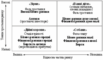 Матриця BCG (БКГ) (рис.2.13) свого часу була значним внеском до інструментарію стратегічного планування, оскільки пов’язувала ринкові чинники діяльності підприємства з фінансовими аспектами функціонування підприємства в коротко - та довгостроковій перспективі. Застосування матриці BCG допомогло усвідомити, що пріоритети в розподілі ресурсів підприємства можуть і мають змінюватися, і частково зрозуміти причини цих змін. Ще однією перевагою такого підходу було те, що створювалося підґрунтя для розробки та раціоналізації стратегій "зростання, стабілізації та виведення на ринок" окремих видів продуктів. Але згодом у матриці BCG, як і в кожного явища, виявилися й недоліки.