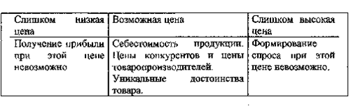 Зная график спроса, расчётную сумму издержек и цены конкурентов, фирма готова к выбору цены собственного товара. Цена эта будет где-то в промежутке между слишком низкой, не обеспечивающей прибыли, и слишком высокой, препятствующей формированию спроса. На рисунке 2 в обобщённом виде представлены три основных соображения, которыми руководствуются при назначении цены. Минимально возможная цена определяется себестоимостью продукции, максимальная - наличием каких-то уникальных достоинств в товаре фирмы. Цены товаров конкурентов и товарозаменителей дают средний уровень, которого фирме и следует придерживаться при назначении цены.