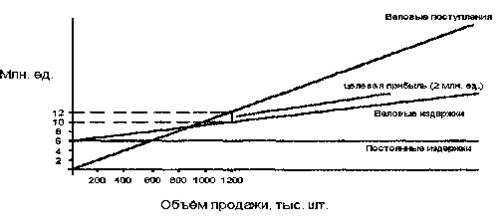 Методика ценообразования с расчётом на получение целевой прибыли основывается на графике безубыточности. На таком графике представлены общие издержки и ожидаемые общие поступления при разных условиях