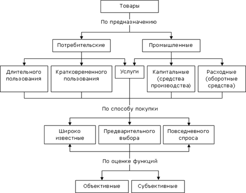Товары классифицируются по разным признакам, что и показано на рис. 1.