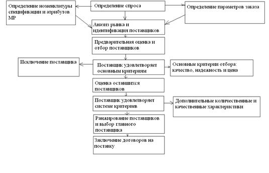 Решая эти задачи, отдел снабжения постоянно взаимодействует с другими подразделениями. На необходимость приобретения того или иного вида ресурса с данными характеристиками указывает производство. Необходимое количество определяется совместно с производственным отделом и финансовыми подразделениями. При определении потенциального поставщика отдел снабжения опирается на информацию, полученную в ходе исследования рынка и анализа всей совокупности возможных поставщиков. Этот вопрос, как правило, находится в компетенции отдела снабжения. Затем, когда поставщик уже выбран, он предлагает свои условия поставки (цена, количество, срок поставки), которые впоследствии корректируются в ходе переговоров с поставщиком. Выбор правильного поставщика - одна из важнейших задач снабжения. Успех деятельности предприятия во многом зависит от сырья и ресурсов, потребляемых им. Надежность поставщика - гарантия бесперебойного обеспечения производственного процесса "на входе". Успех работы любого предприятия в большой степени зависит от точности обеспечения производства необходимыми сырьевыми ресурсами по показателям количества, качества и времени. Следовательно, от точности определения показателей, характеризующих рынок закупок, зависит создание оптимальных условий функционирования производственных подразделений [3, с 85].