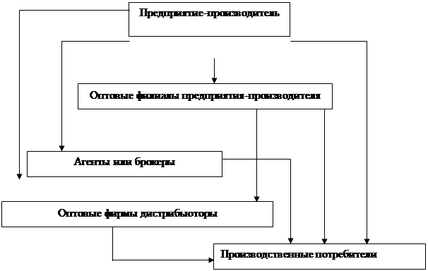 - производитель может продавать свою продукцию оптовым торговцам, которые сбывают ее потребителям;