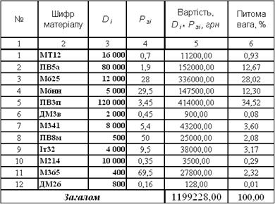 Таблиця 2 - Питома вага позицій матеріалів
