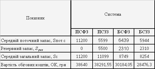 Для всіх систем, виходячи з розрахунків руху запасів матеріалу, які виконані в розділах 3.2–3.5, обчислюємо суму обігових коштів, яка вкладена в запаси матеріалу.