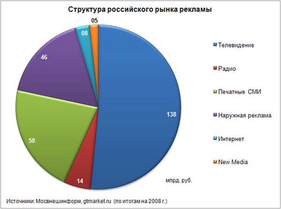 3. Средства массовой информации или средства размещения рекламы, предоставляющие место и время для рекламных обращений с целью донесения их до потребителя. Другими словами, это организации, предоставляющие эти средства, занимающиеся посредническими услугами в сфере размещения рекламы, например внешней рекламы, рекламы на транспортных средствах. Вопросами размещения рекламы в средствах массовой информации - в печати, на телевидении и радио - занимаются отделы продаж или специальные маркетинговые службы. Их услуга заключается в продаже места в печатных изданиях или эфирного времени на телевидении и радио для рекламы. Третий участник рекламной деятельности в законе «О рекламе» [3] называется рекламораспространителем и определяется как «юридическое или физическое лицо, осуществляющее размещение и (или) распространение рекламной информации путем предоставления и (или) использования имущества, в том числе технических средств радиовещания, телевизионного вещания, а также каналов связи, эфирного времени и иными способами».