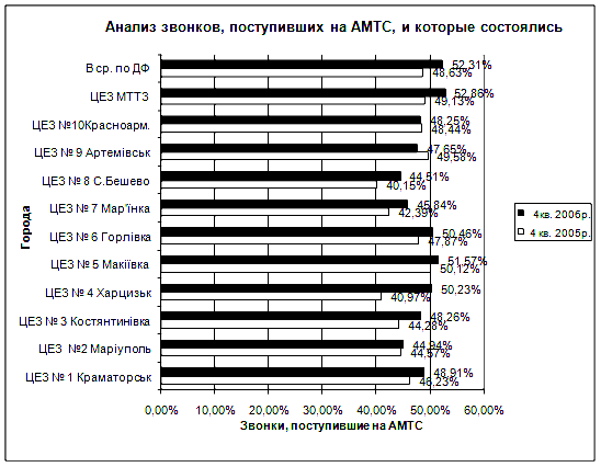 Исходя из данных диаграммы видно, что за 1 год по отдельным городам наблюдается улучшение связи. Так, в г. Краматорске в 2006г. по сравнению с 2005г. состоявшиеся разговоры увеличились на 2,68%; в г. ариуполе – 0,37%; в г.Константиновке – 3,98%; в г.Харцизке - 9,26%; в г.Макеевке – 1,45%; в г.Горловке – 2,59%; в г.Марьенке – 3,45%; в С.Бешево – 4,36%; в г.Артемовске (1,93%) и г.Красноармейске (0,19%), наоборот, в 2005 году связь оказалась более качественной. Качественная связь ОАО «Укртелеком» была наиболее ощутима в г. Харцизке.
