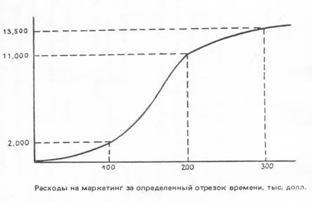 Одна из возможных функций реакции сбыта, предоставлена на рисунке. Она показывает, что чем больше фирма тратит в рамках конкретного отрезка времени на маркетинг, тем выше вероятный объем сбыта. Однако функция реакции сбыта может иметь и другой вид: