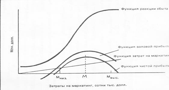 Затем функцию маркетинговых затрат представляют в виде прямой, которая начинается на нулевой отметке и идет наклонно вверх в отношении 1 доли маркетинговых затрат на каждые 10 доли. После этого получают функцию прибыли - нетто, вычитая функцию маркетинговых затрат из функции валовой прибыли. Функция прибыли - нетто говорит о положительной чистой прибыли при уровне маркетинговых затрат между М низ