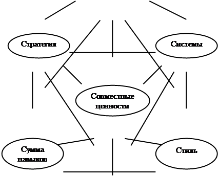 )в планируемое состояние. Теоретическим фундаментом научных вопросов организации и управления производством являются методы кибернетики, теории систем, системотехники, праксеологии и бионики. Весьма плодотворным с теоретической и практической точек зрения явилось предложение известных американских специалистов в области менеджмента Т. Питерса и Р. Уотермана [101] рассматривать организацию как единство семи основных переменных: структуры (structure), стратегии (strategy), системы и процедур управления (systems), совместных, т.е. разделяемых всеми, ценностных установок (sharedvalues), совокупности приобретенных навыков, умения (skills), стиля управления (style) и состава работников, т.е. системы кадров (staff).