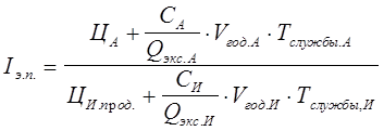 Як було з'ясовано в другому розділі, у даний час прийнято, щоб уникнути вище описуваної погрішності, заміняти при розрахунку показника конкурентноздатності за економічними параметрами продажної ціни на ціну споживання, що включає крім першої складової ще й експлуатаційні витрати за весь термін експлуатації. Однак, у такому випадку, виникають труднощі у визначенні останньої складової показника ціни споживання, у результаті того, що аналізу підлягає довгостроковий період експлуатації машини. З цією метою краще використовувати такий показник, як собівартість вироблення товарної продукції використовуваною машиною, значення якої мається на кожному підприємстві-виробника останньої, тоді вираз приймає вид: