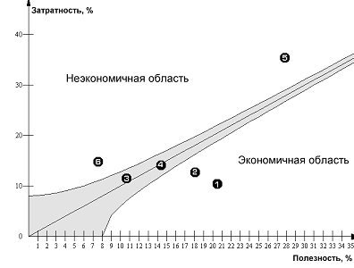 Если компонент изделия находится выше идеальной линии (зоны целевых затрат), то он переоценен, его затраты необходимо сокращать (потенциал для снижения себестоимости). Делать это нужно до тех пор, пока соответствующий индекс целевых затрат не приблизится к единице. Если же компонент оказался ниже идеальной линии, то следует проверить, на должном ли уровне реализована его функциональная часть, т.к. такой компонент покажется потребителю слишком простым (необходимость совершенствования компонента).
