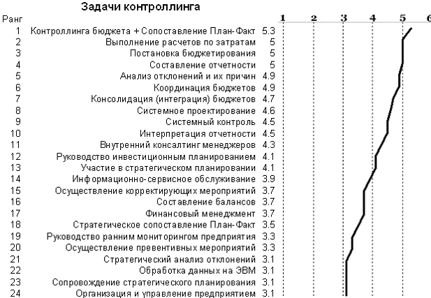 В верхней части списка находятся важнейшие задачи контроллинга на предприятии. Данная диаграмма явно демонстрирует, что классические оперативные задачи контроллинга во главе с постоянным сопоставлением плана и факта доминируют в практике ежедневной работы контроллеров, и что контроллинг, вопреки теоретическим соображениям, в первую очередь ориентирован на поддержку оперативного менеджмента.