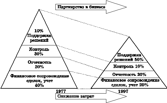 Как уже неоднократно было отмечено, контроллинг стал инструментом поддержки принятия решений. Объемы контрольной функции снизились за счет автоматизации, выявление большинства отклонений осуществляется в компьютерной системе, а контроллер лишь анализирует их. Отчетность составляется максимально с учетом запросов и требований менеджеров. Уменьшение площади треугольника задач, свидетельствует об относительном снижении затрат на систему контроллинга предприятия, иначе говоря, о росте эффективности ее работы. На современном западном предприятии контроллер, выполняя навигационную функцию, становится "деловым партнером" руководителя.