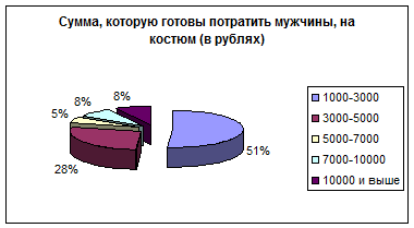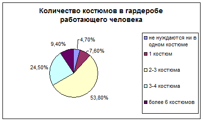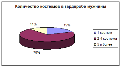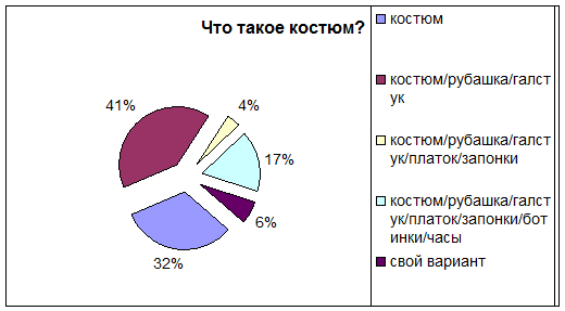 Особый интерес представляет вопрос анкеты «Что мужчины включают в понятие «костюм». При проведении опроса выяснилось следующее: 41% мужчин считают, что в понятие «костюм» входят брюки, пиджак, рубашка и галстук, немного меньше — 32% — говоря о костюме, подразумевают только пиджак и брюки. Кроме того, мужчины покупают аксессуары к костюмам.