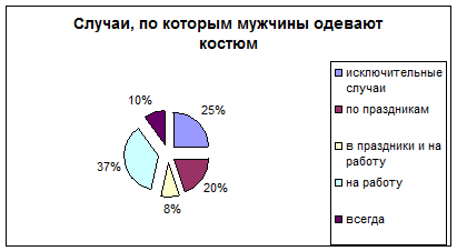 Итак, в процессе проведения исследования было выявлено, что 99% мужчин носят костюмы, причем выяснилось, что примерно половина мужчин носит их в большинстве случаев – на работу и всегда, а другая половина одевает их только по праздникам или в исключительных случаях. Надо отметить, что, выделяя категорию «всегда», подразумеваетсято, что мужчина, не задумываясь, одеваеткостюм, куда бы он ни шел,
