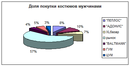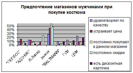 Также выяснилось, что мужчины в основном предпочитают покупать костюмы на рынке не потому, что там качественно, а потому что их устраивает цена. Но все-таки подавляющее количество мужчин 25% опрошенных покупают костюм в магазинах это «ПЕПЛОС» и «АДОНИС». «АДОНИС» лидирует по количеству опрошенных – 10% мужчин покупают там костюм, так как их устраивает и цена и качество данного магазина мужской одежды.