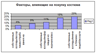 Несмотря на то, что в анкете содержалось предложение указать 3 основных фактора, влияющих на приобретение костюма, 19% респондентов указали лишь 1 или 2 фактора. Отметим, что в ответах присутствовали факторы в следующем процентном соотношении:
