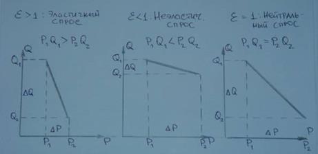 В первом случае при эластичном спросе низкой эластичности существует точка оптимальной цены и спроса, во втором случае при неэластичном спросе мы выпускаем минимально возможное количество изделий и получаем сверхприбыль, в третьем случае при очень эластичном спросе мы производим максимально возможное количество изделий.