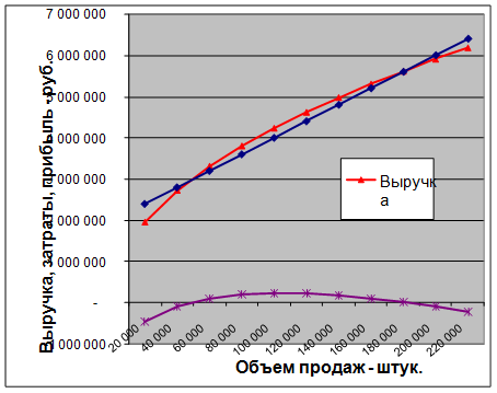 На рисунке 6.6 показаны виды функций выручки, затрат и прибыли, рассчитанные по варианту 1 из таблицы 6.6.. По горизонтальной оси отложены значения Q объема продаж (шт), по вертикали значения указаны в рублях.