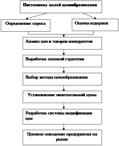 Ценообразование на предприятии представляет собой сложный процесс, состоящий из нескольких взаимосвязанных этапов: сбора и систематического анализа информации о рынке, обоснования основных целей ценовой политики предприятия на определенный период времени, выбора методов ценообразования, установления конкретного уровня цены и формирования системы скидок и надбавок к цене, корректировки ценового поведения предприятия в зависимости от складывающейся рыночной конъюнктуры.