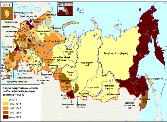 Рассматривая ИПЦ в целом по России и по регионам (рис. 2), можно отметить, что Воронежская область показывает наихудшие результаты не только в ЦФО, но и в целом по России наряду с Ивановской, ленинградской областями, Республикой Алтай и Дальневосточным ФО имеет самый высокой уровень ИПС – более 105,1 %