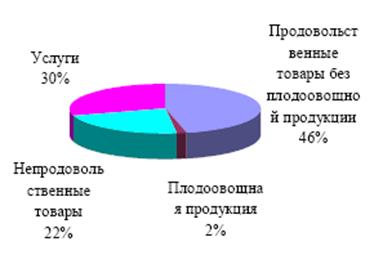 Доля продовольственных товаров в товарной структуре рынка розничной торговли составляет 45%. На сегодняшний день темпы снижения доли продовольственных товаров в обороте розничной торговли ускорились, что обусловлено опережающими темпами роста цен на продовольственные товары и изменением структуры потребления населения России.