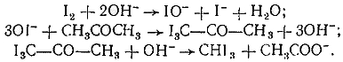 1. Реакция образования йодоформа. При взаимодействии ацетона с раствором иода в щелочной среде образуется йодоформ: