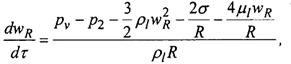 за тем исключением, что в данном случае значение Р2 в (3) определяет не внешнее давление рeх, инициирующее рост пузырьков, а среднее давление в межпузырьковом объеме ансамбля pl (t). Это среднее давление вычисляется путем интегрирования функции Pl(r,t) по объему жидкости в ячейке и последующего деления на этот объем. Интегрирование правой части (2) приводит к уравнению