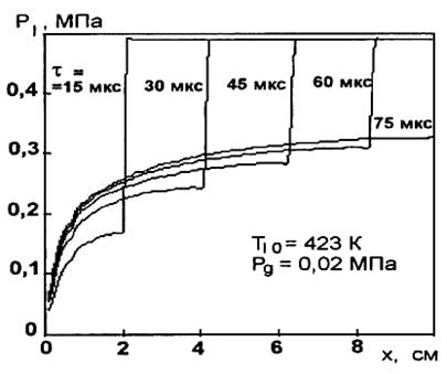 На рис. 2 показано распределение давления в жидкости по длине канала в различные моменты времени в начальной стадии разгерметизации закрытой трубы при прохождении волны разрежения в однофазной жидкости. Со временем давление в жидкости за фронтом волны быстро повышается, стремясь по мере приближения волны к закрытому концу трубы к значению psat(Tlо). Тем не менее, как показали исследования, на всех стадиях истечения максимальное значение давления внутри канала всегда существенно меньше давления насыщения и отличие это тем больше, чем выше температура жидкости.