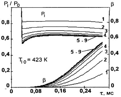 На рис.3 показано изменение со временем объемного паросодержания b и величины приведенного давления /p0 в одном из сечений канала (i=50) при различных значениях противодавления. Видно, что, начиная с определенного значения рсr, дальнейшее понижение противодавления не влияет на характер этих зависимостей (кривые 5-9).